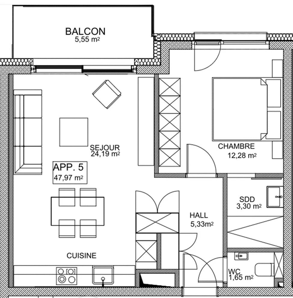 Hall d'entrée avec placard intégré et WC séparé, un lumineux séjour / salle à manger avec cuisine ouverte et accès au balcon de ±6m², une salle de douche ainsi qu'une chambre à coucher.